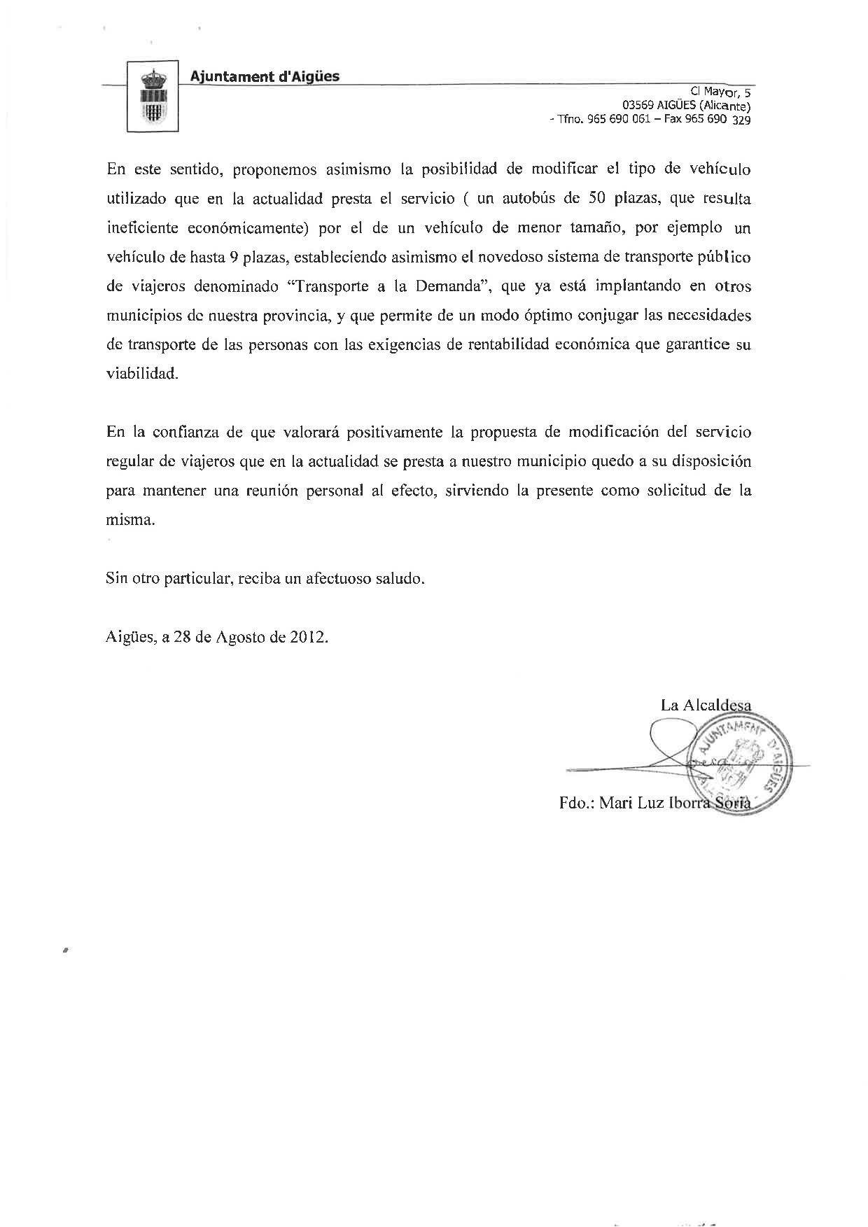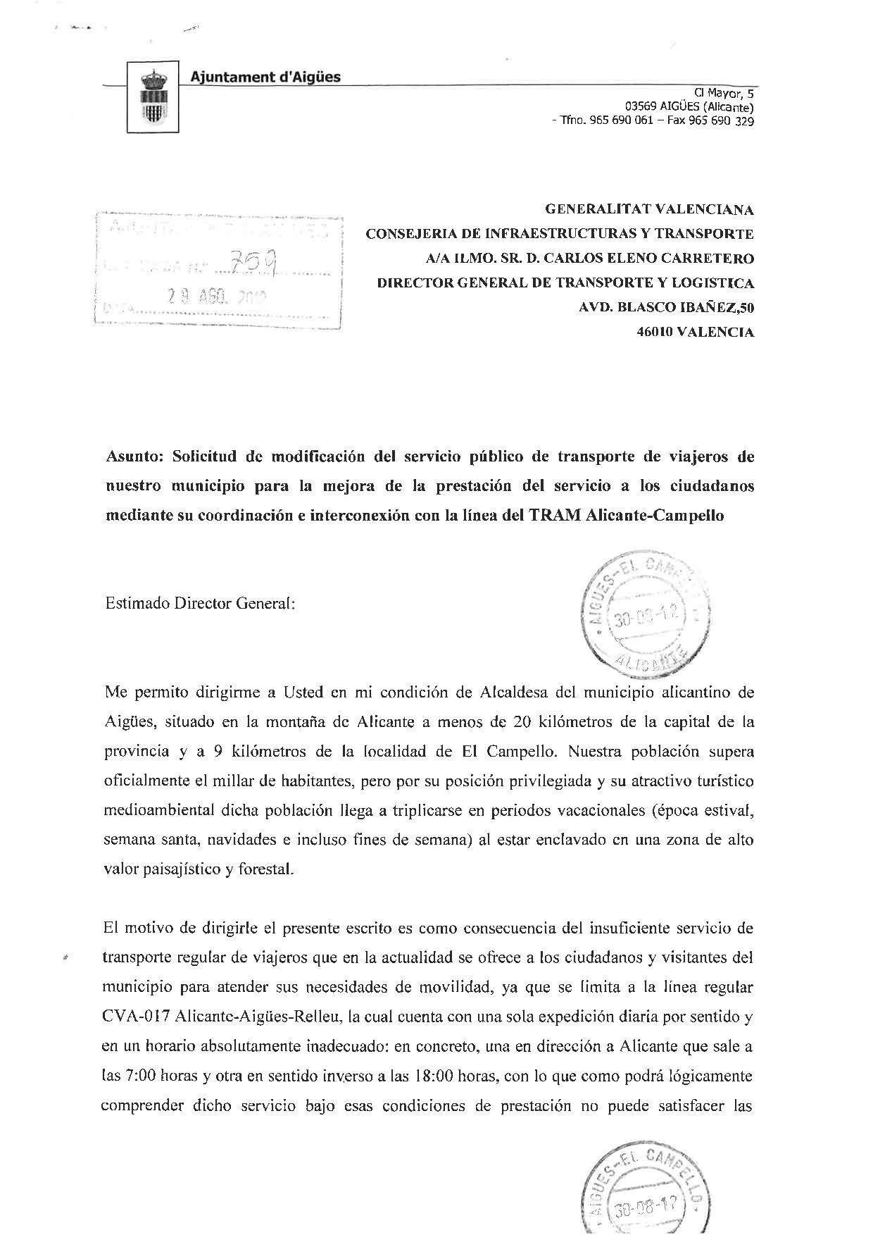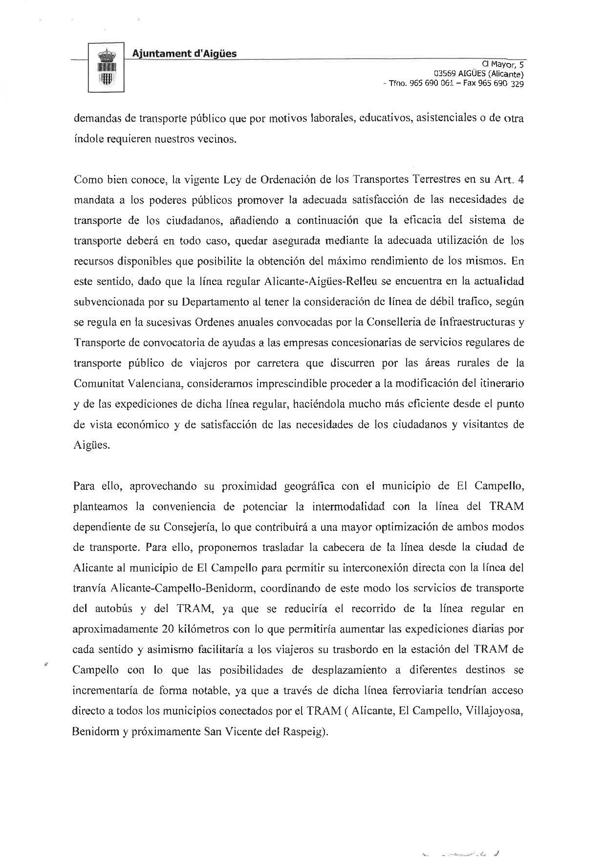 Solicitud de Modificación del Servicio Público de Transporte de viajeros de nuestro municipio para la mejora de la prestación del servicio a los ciudadanos mediante su coordinación e interconexión con la línea del TRAM Alicante-Campello