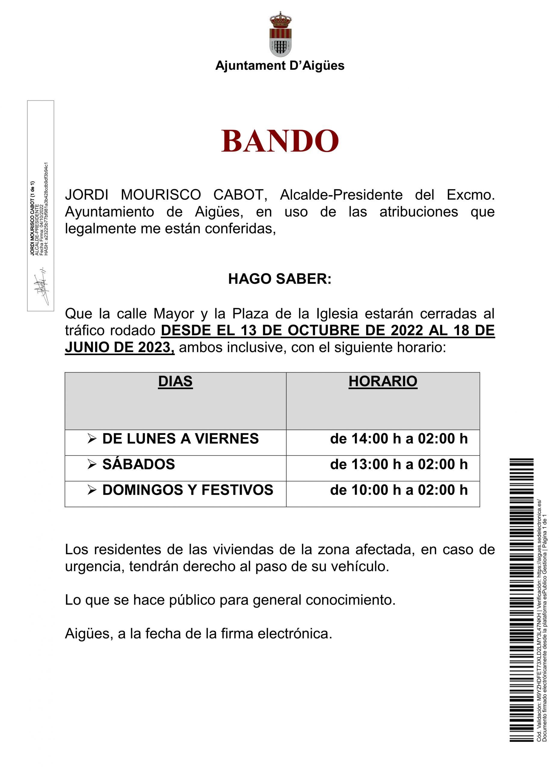 BANDO horario de cierre al tráfico rodado de la calle Mayor y Plaza de la Iglesia del 13-10-2022 al 18-06-2023 BANDO horario de cierre al tráfico rodado de la calle Mayor y Plaza de la Iglesia del 13-10-2022 al 18-06-2023
